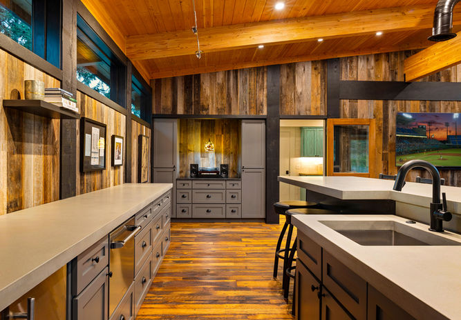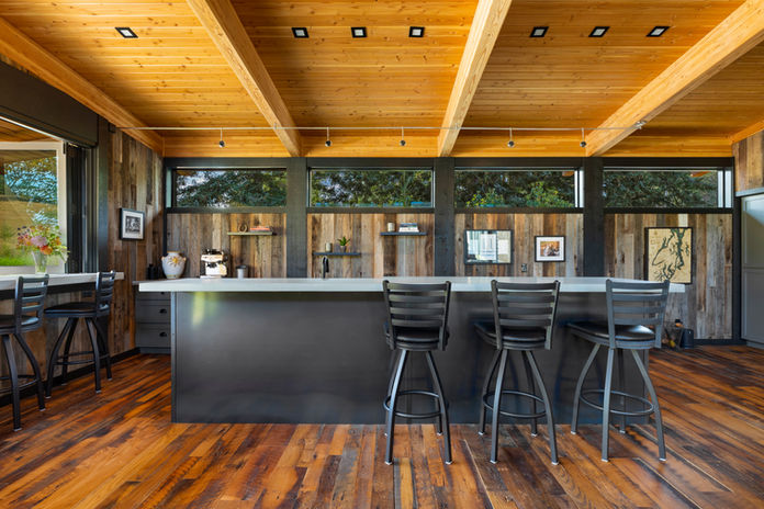 The homeowners wanted to create a modern industrial space that harmonized with the original historic farmhouse.