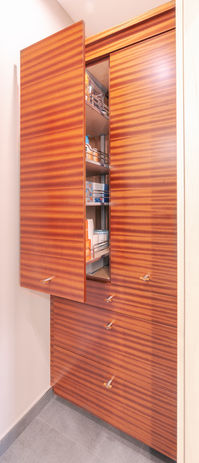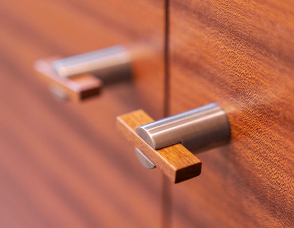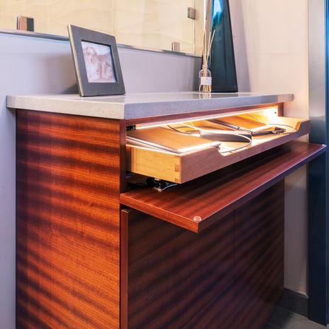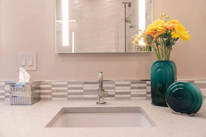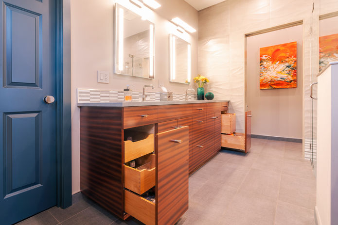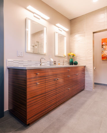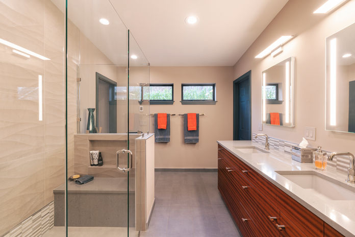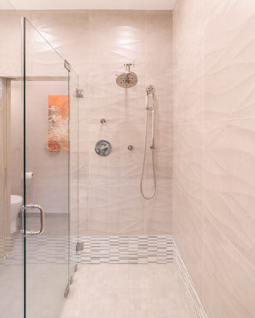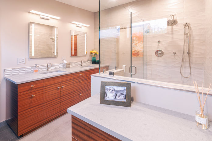 This master suite remodel features phenomenal tile work to create a beautiful, sleek bathroom design.